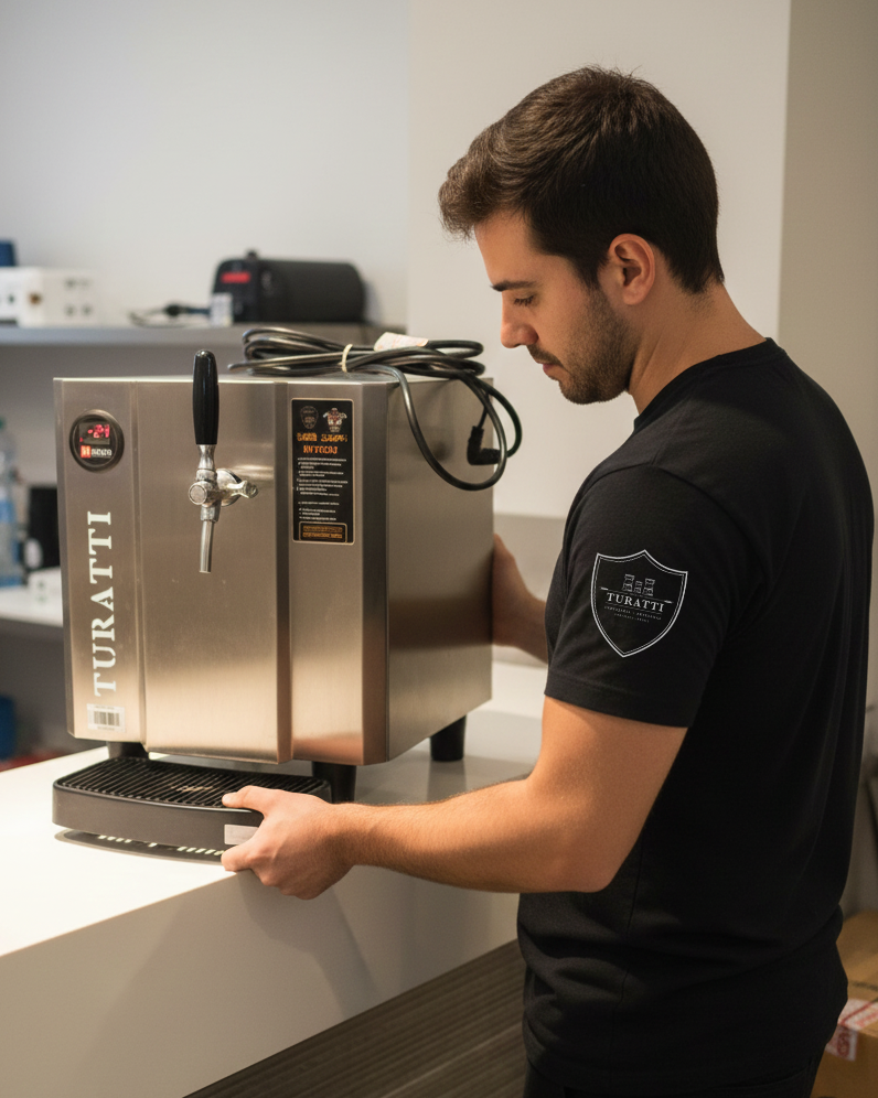 Para agilizar o processo, pedimos que a chopeira esteja posicionada em um local de fácil acesso para a equipe Turatti. Isso reduz o tempo de desmontagem e evita riscos durante o transporte.